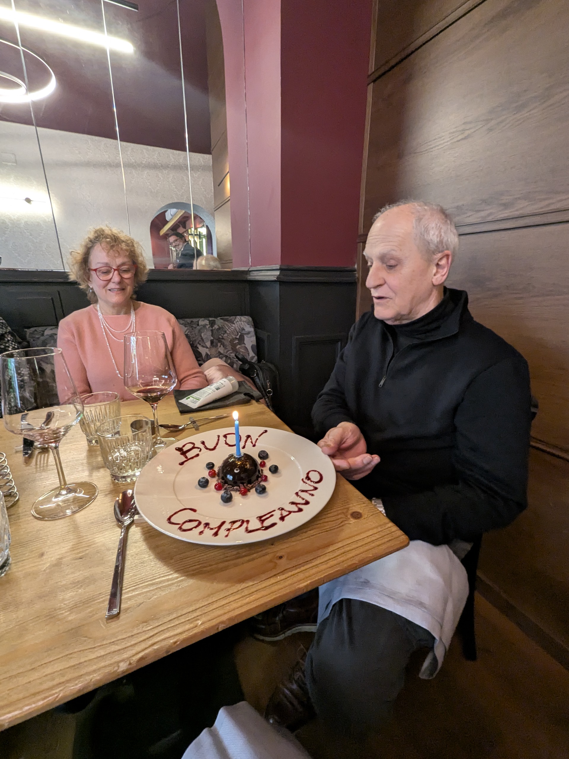 ご本人は、誕生日を祝ってもらうことになんの感激もしないのですが、息子たちがわざわざトリノから670kmの道のりをやってくる。